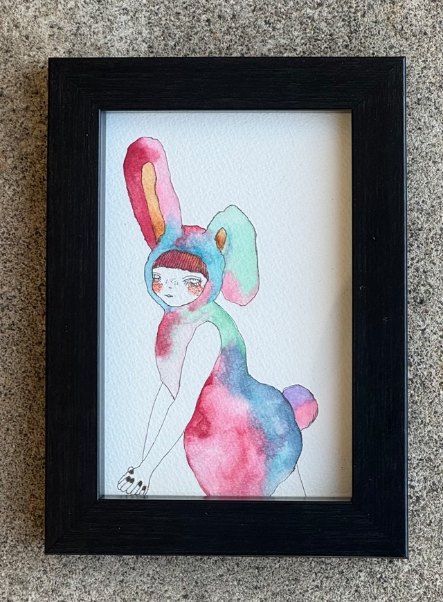 うさぎの格好をした女の子 愛葉の鉛筆水彩画とはまた雰囲気がかなり違い、ボールペンでしっかり縁取りされ淡くて美しい水彩とのバランスが絶妙の一作です。 ボールペン、水彩画 ハガキサイズ Ballpoint pen and watercolor painting on postcard paper 額装 額縁素材 ガラス、木、カラーblack 窓:約14cm×9cm 外枠:約18.2cm×13.2cm 立てかけ、壁掛け可能 額装の状態ですと一部絵が見えにくくなっている場合があります。ご了承ください。 ご注文後の商品の返金、返品交換は承っておりません。 写真と実際の商品の色味が若干異なる場合がありますがご了承下さい。 レターパックライトでの発送につき、時間指定はできません。 * No refunds or exchanges Thank you for your understanding Please note that there may be slight differences between the photograph and the original accessories.Thank you.