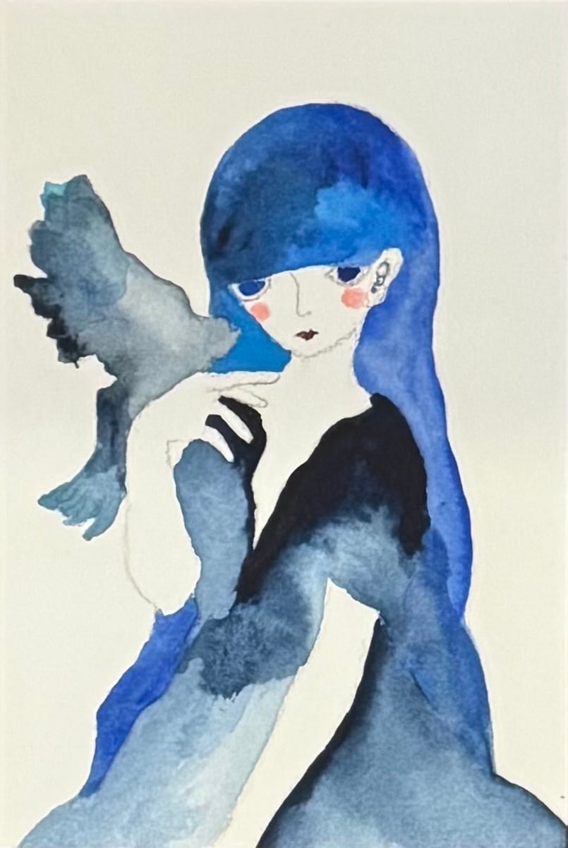 頬をうっすらオレンジに染めたロングヘアの少女も様々な青で描かれています。