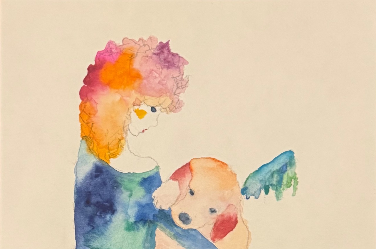 可愛らしいレトリバーの子犬が少女の腕にもたれかかっています。
