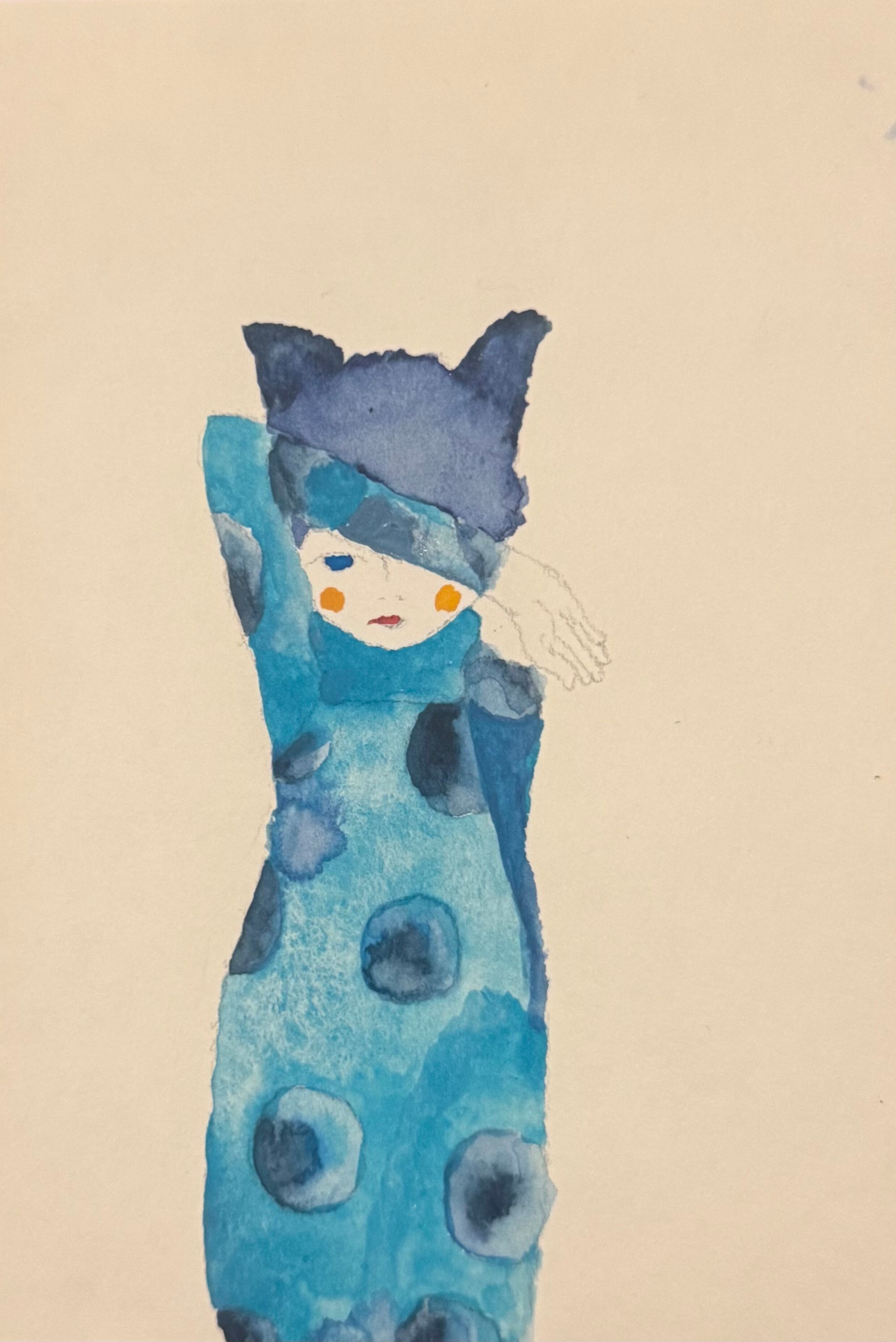 水玉のドレスを纏っておめかし。一体何を見つめているのでしょう。