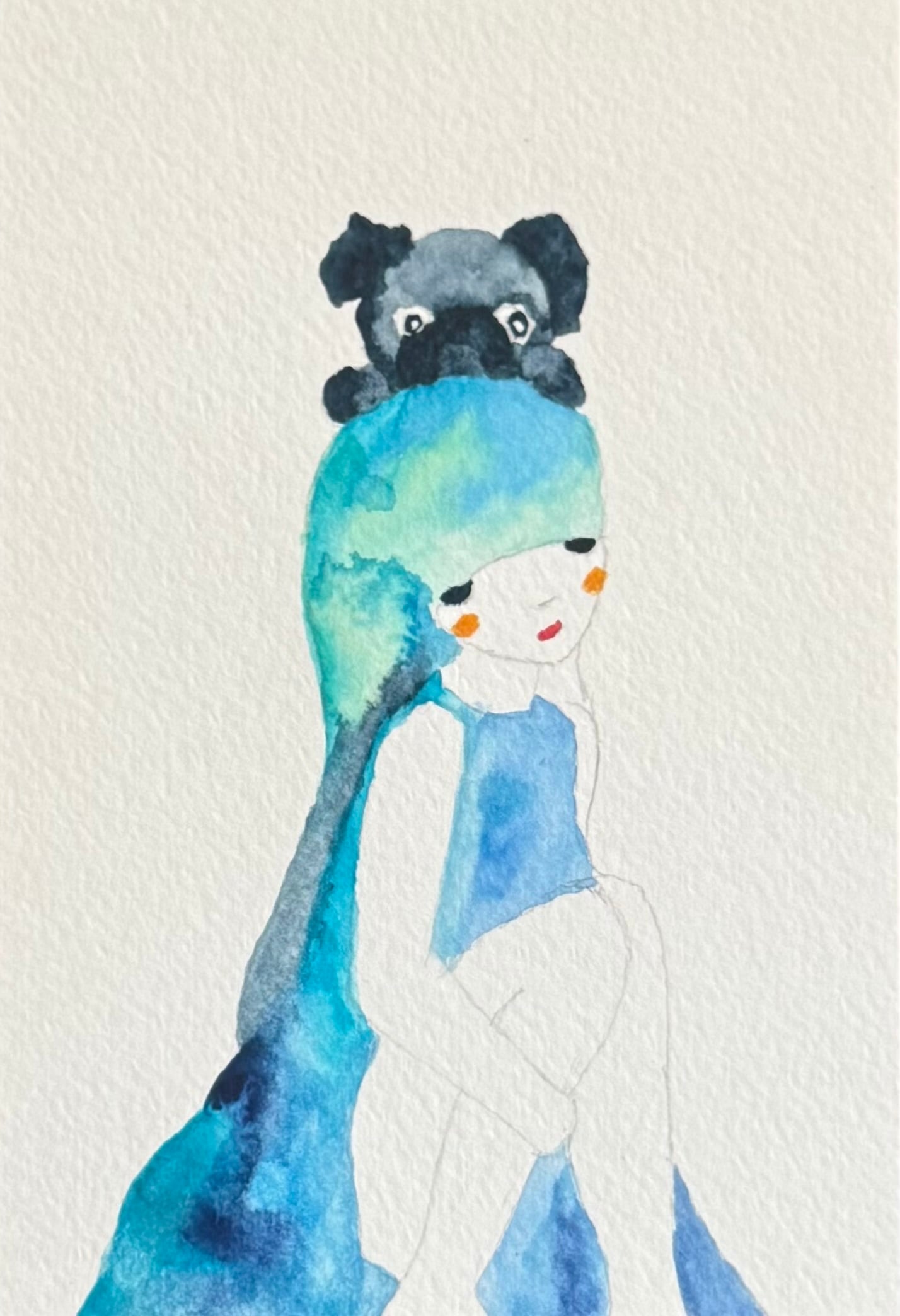 ひょっこり頭の上に現れた群青のかわいい子犬。目がキョロキョロしています。動物と共にいる少女の作品も増えてきました。