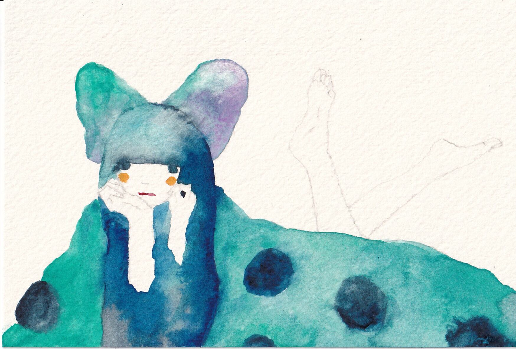 ふわふわの水玉の中で大きなリボンの女の子が想いを巡らしています。