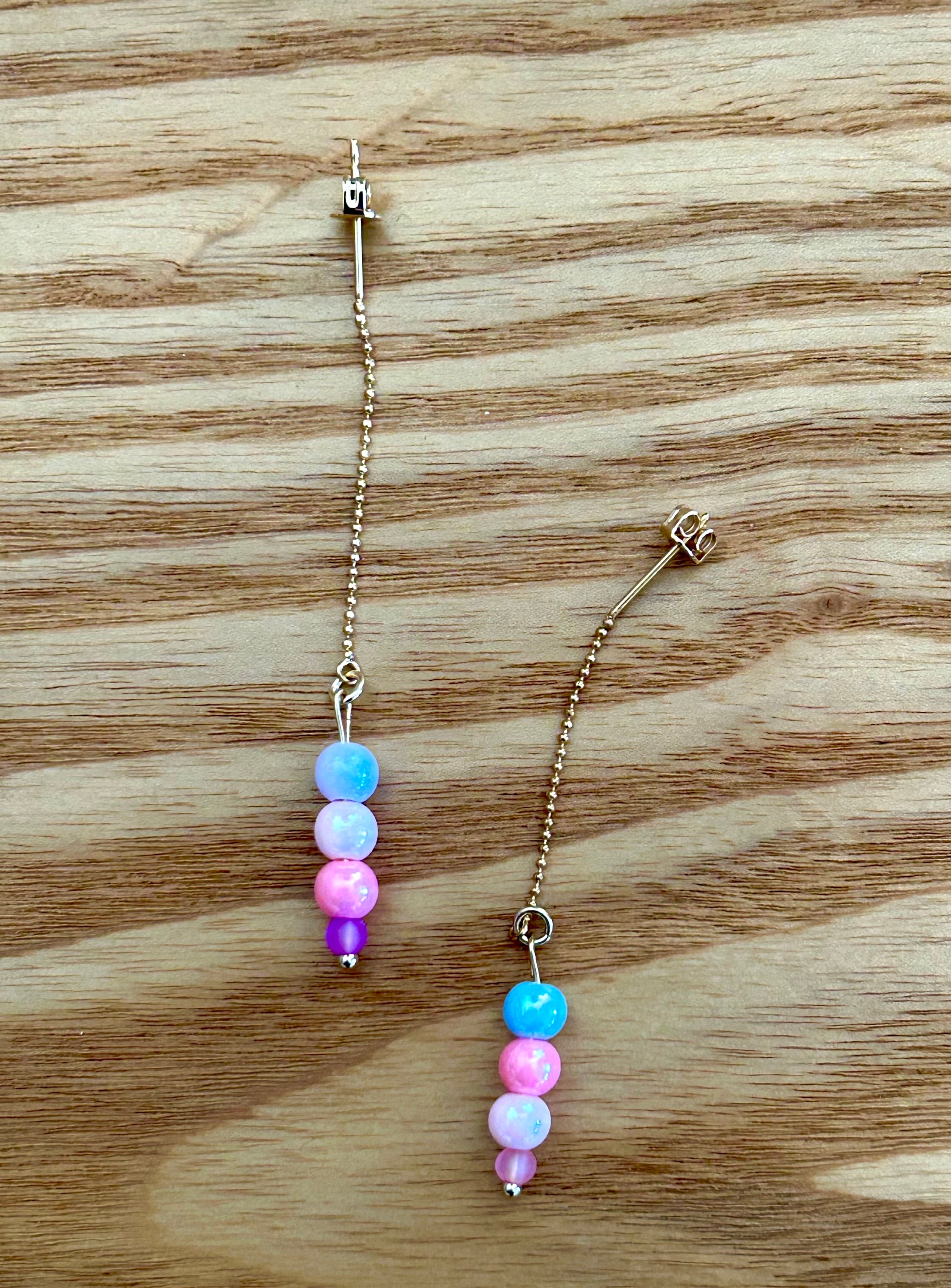 繊細なゴールドカラーのチェーンの先で揺れるミルクキャンディのような甘いビーズたち。軽くて付けやすく、風にゆれたら素敵な一点。