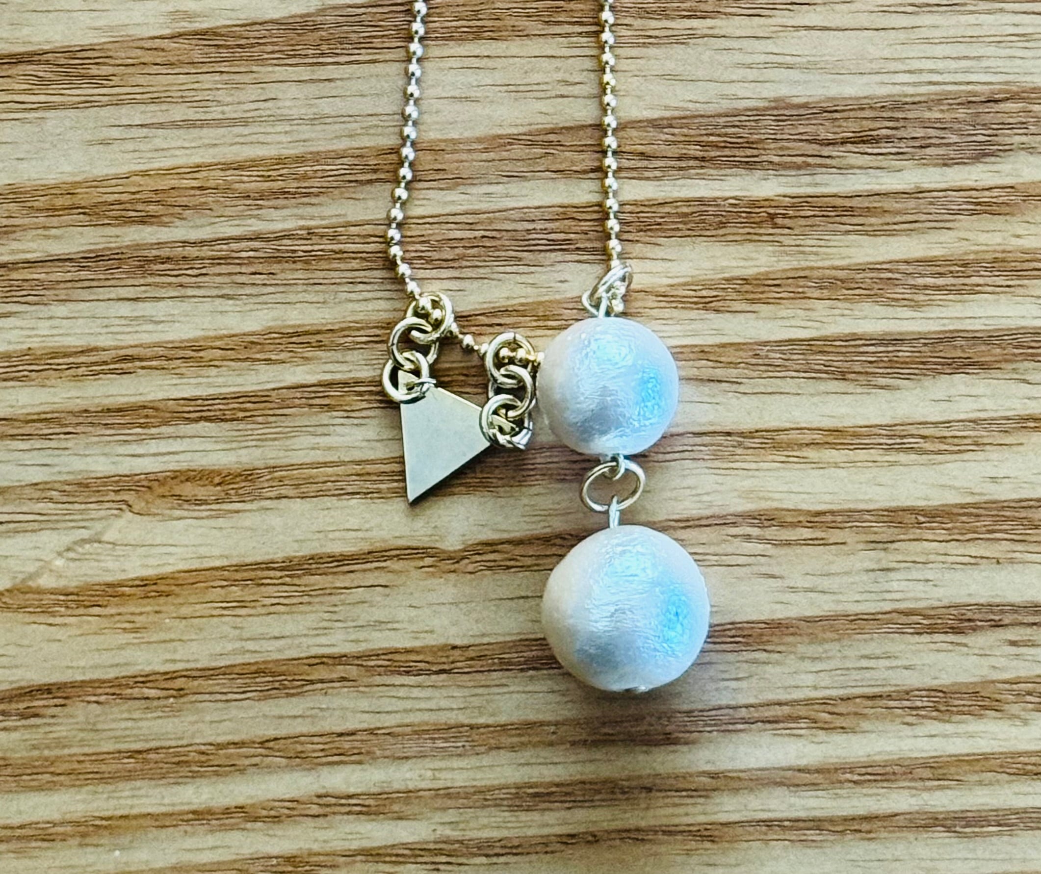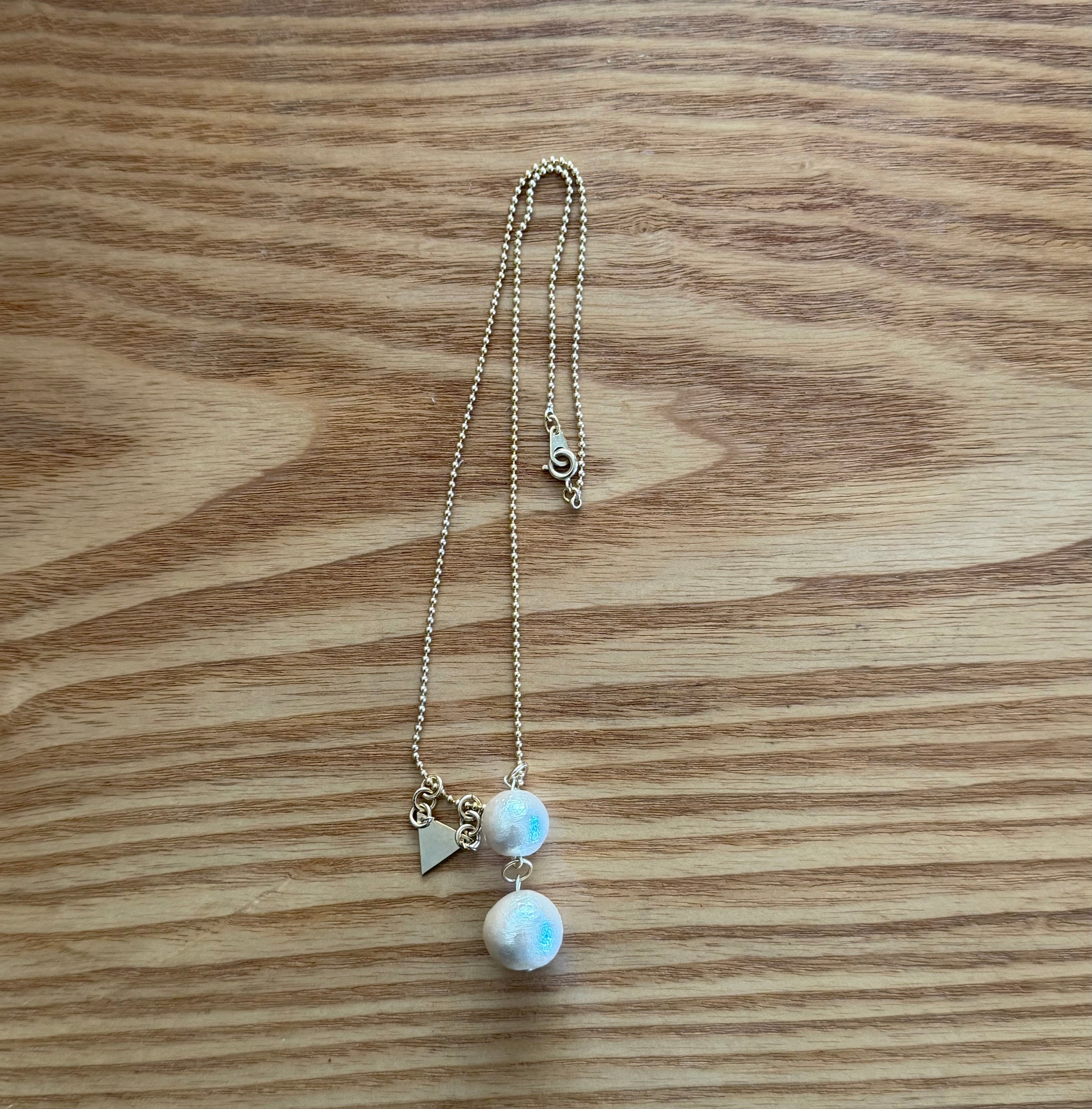 ゴールドカラーのボールチェーンに、軽くて柔らかく繊細な光を放つサイズ違いのコットンパール、そしてとなりにはエッヂーゴールドなトライアングルプレートがメタリックに突き刺さる一点。