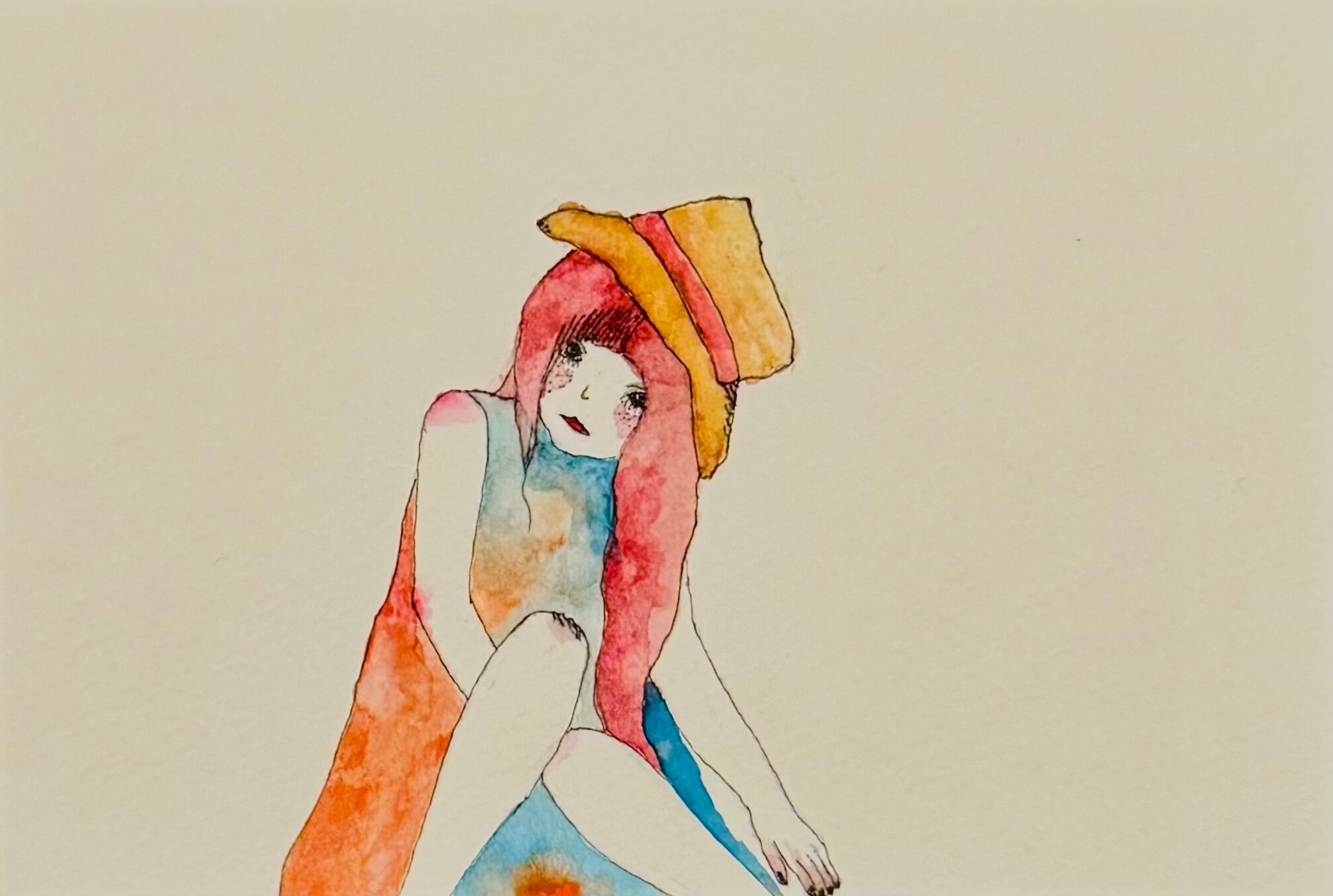 何かを語りかけているような少女。繊細な色彩のワンピースに茶色のハット。