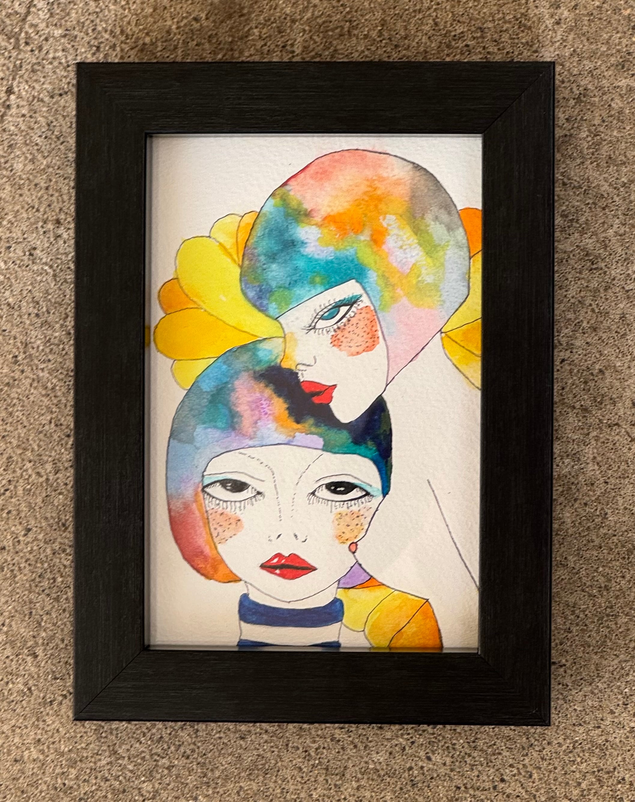 Ballpoint pen and watercolor painting on postcard paper