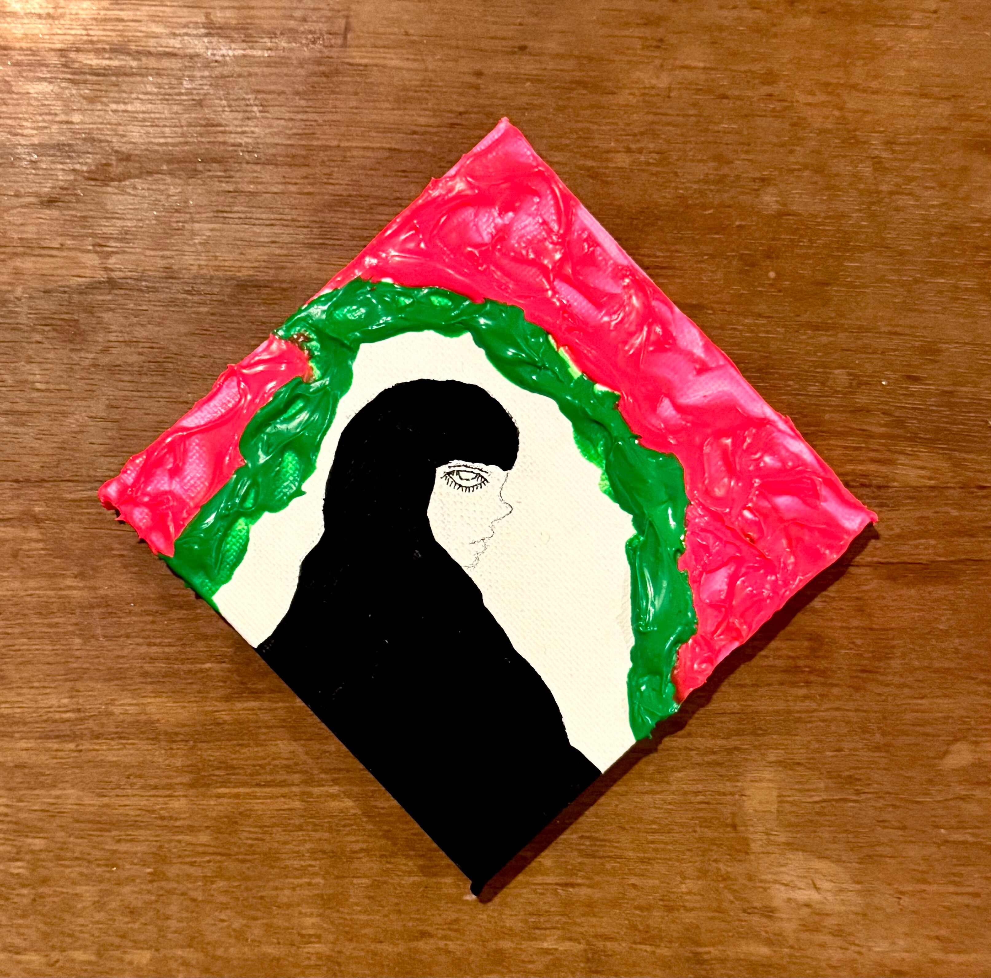 10×10cmのミニアチュールアクリル画。黒髪と思い切った色使いのペインティングです。